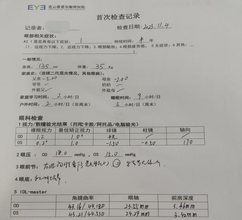 两年前的冬天,8岁的小杰总跟妈妈抱怨“黑板上的字像蒙了一层雾”,小杰妈妈立刻带着孩子寻找连云港靠谱的眼科医院,最终选择了连云港爱尔眼科医院。到院后,唐青青主任凭借丰富的临床经验,为小杰安排了全面的视功能检查。检查结果显示,小杰的左眼裸眼视力仅0.2+,近视度数为-1.50DS/-0.50DC,眼轴长度也略高于同龄儿童正常范围,右眼暂未发现近视。结合小杰爱看书、网课时间长的用眼习惯,唐青青主任给出专业建议:及时佩戴近视防控功能镜,同时建立视觉发育档案,定期复查监控视力变化。