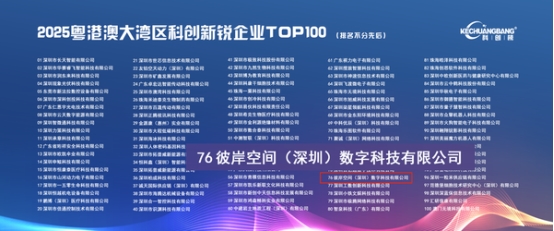 [深圳,2025年12月30日] —— 今日,“2025湾区科创节·第八届深港澳科创大会”在深圳南山举行。大会发布了备受瞩目的“2025粤港澳大湾区科创新锐企业TOP100”榜单。彼岸空间(深圳)数字科技有限公司(以下简称“彼岸空间”)作为企业数字化服务领域的代表企业,凭借扎实的技术积淀与市场实践,成功荣登该榜单。
