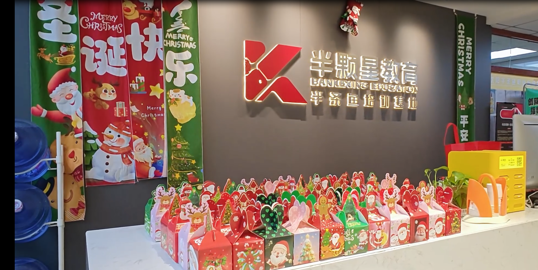 活动从12月20日持续至12月24日,校区装饰处处体现着节日的温暖与教育的融合。传统的圣诞红与绿色装饰中,巧妙地融入了传统、设计和教学器材的元素。“我们想要的不仅仅是庆祝一个节日,更是创造一个让同学们能感受到教育温度的空间。”半颗星培训学校的老师们在谈到活动初衷时表示。半颗星培训学校为不同年龄段的学生准备了多样化的“暖心互换盲盒”,每个礼盒都经过教师和同学们精心选择设计,既有趣味性又融入圣诞主题中。