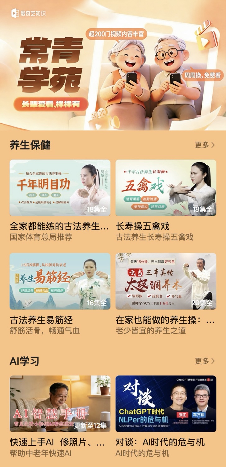 近日,爱奇艺知识频道正式上线面向中老年用户的知识内容专区——“常青学苑”。专区整合全网优质知识内容,覆盖养生保健、AI应用、摄影摄像、乐器演奏、书法艺术、绘画创作、声乐戏曲、棋牌娱乐、哲学宗教、运势占卜、文史知识等十余个特色类别,为中老年用户构建起全方位的课程体系。以往中老年内容大多集中于娱乐与资讯类型,此次爱奇艺上线“常青学苑”专区,精准满足了中老年用户多样化的精神文化需求,让他们畅享优质课程。