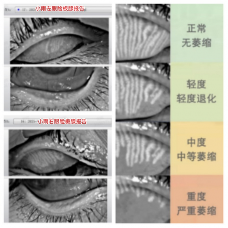 医生诊断,小雨患的是睑缘炎相关角结膜病变(BKC),并伴有严重的睑缘炎和睑板腺功能障碍。为什么反复发作?进一步的检查揭示了真相:小雨左眼的睑板腺已经严重萎缩,右眼也中度萎缩。“16岁的年纪,40岁的腺体功能”——这正是她眼睛反复发炎的根源。