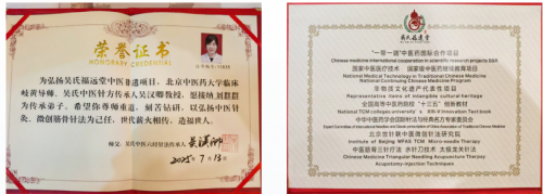 刘群群(刘园然)深知学海无涯,始终保持旺盛的求知欲。2025年7月,刘群群(刘园然)迎来专业成长的又一重要节点——正式拜师吴氏中医针法第五代传承人、中医筋骨针法与水针刀疗法发明人、北京中医药大学岐黄导师吴汉卿教授,成为其亲传弟子。为了精进技艺,她还参加了北京世针联中医微创针法研究院举办的“吴氏中医筋骨针法与水针刀技术综合研修班”,不断完善知识体系。此次深造,让她将水针刀、筋骨针法融入自身诊疗体系,进一步拓展了在颈肩腰腿痛、头晕头痛、神经痛等痛症治疗上的维度,实现了“埋线+特色针法”的技术融合。