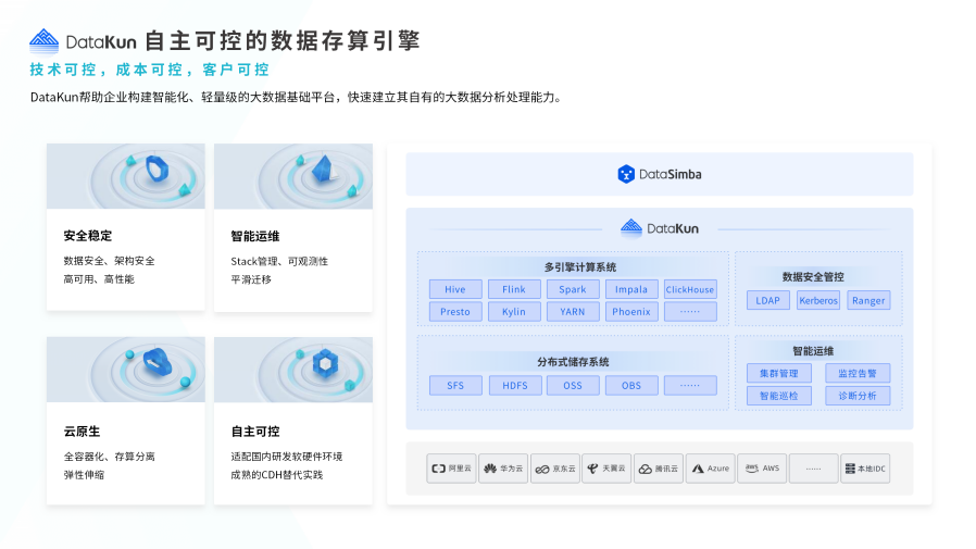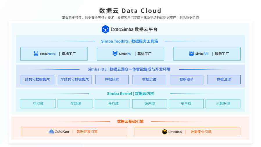 专业能力:团队由阿里前数据专家领衔,拥有超150项软件著作权与55项专利,核心产品数据云平台DataSimba以跨平台、云原生、自主可控、数据安全、湖仓一体为技术内核,搭载自研存算引擎DataKun,1小时即可完成部署,3分钟实现集群创建,轻松应对海量数据的实时处理与智能分析需求。