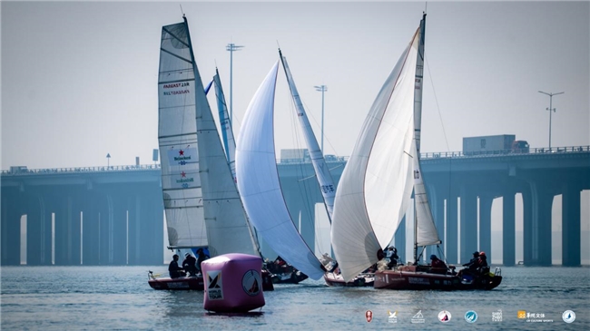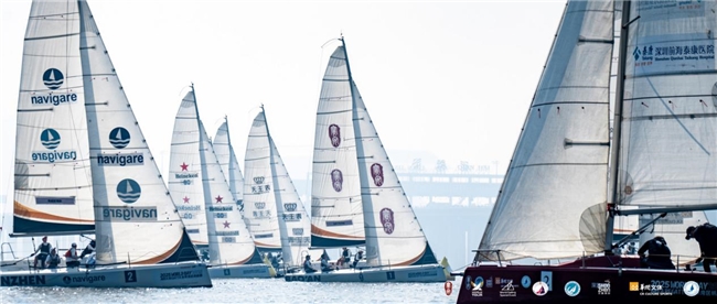 开赛首日,前海湾海域风力维持在4-5节。在备受关注的大帆船组别群发赛中,两组各10支高水平船队展开了激烈的绕标竞速: