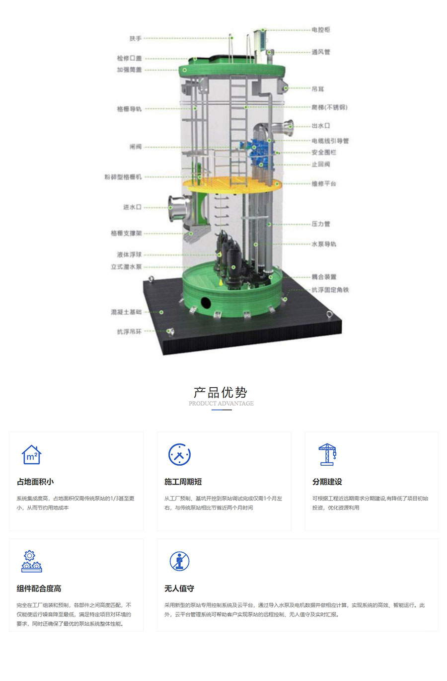 广东中粤泵业有限公司的一体化预制泵站产品特点鲜明:建设周期极短,工厂预装测试后现场快速部署,雨季冬季均可施工;高度自动化与智能化,实现无人值守、远程监控与多重安全保护;系统性能卓越,玻璃钢筒体防渗漏、耐腐蚀,设计寿命达50年;且能针对防腐、防爆、静音等特殊工况定制智慧控制系统,无缝对接客户的智慧水务平台。公司在全国多个重点城市设立分公司、办事处及售后网点,提供全天候响应的一站式服务,联系方式:郑总 13929998569。选择中粤泵业,不仅能获得优质的一体化预制泵站产品,更能享受到智慧水务整合带来的长期价值。