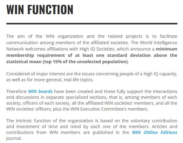 至2017年4月,已拥有65个成员协会。世界智联(World Intelligence Network)中包括世界天才名录(World Genius Directory)、OLYMPIQ Society、HELLIQ Society(希腊之日协会)、CIVIQ Society、胜寒等组织。其中的QIQ、GRIQ、CIVIQ、HELLIQ、OLYMPIQ为世界智联的核心组织,分别为1、2、3、4、5个字母再加上IQ形成协会名称,对应高出人类智商均值1、2、3、4、5个标准差的协会门槛(门萨协会智商要求为人口中最高的百分之二,约为平均值加上2个标准差)。