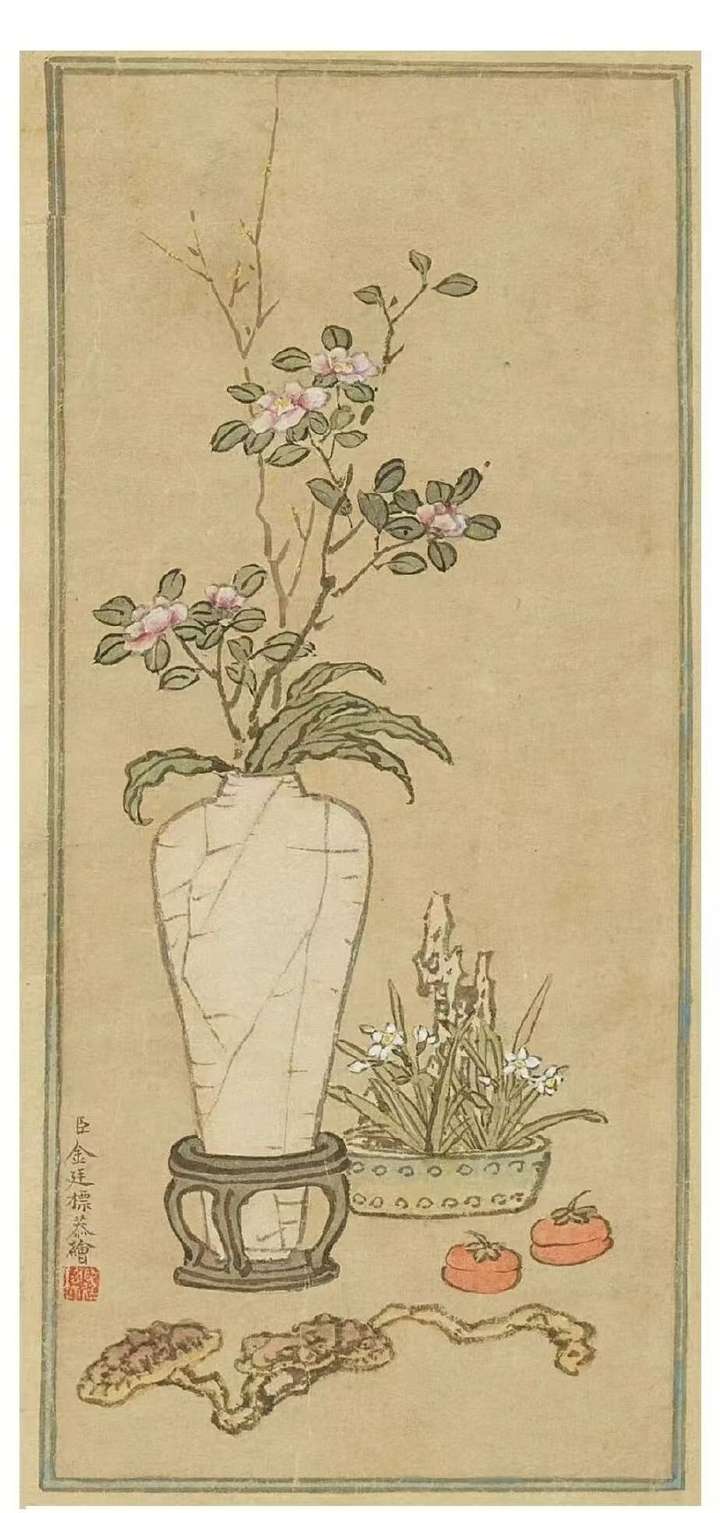 《曹大家授书图》的特别之处,还在于画中藏着一处精巧的“画中画”——壁间悬挂的《岁朝清供图》。白瓷瓶内,梅花与山茶相映成趣,其后放置水仙湖石一盆,并有柿子与如意,暗合“事事如意”的美好期许。