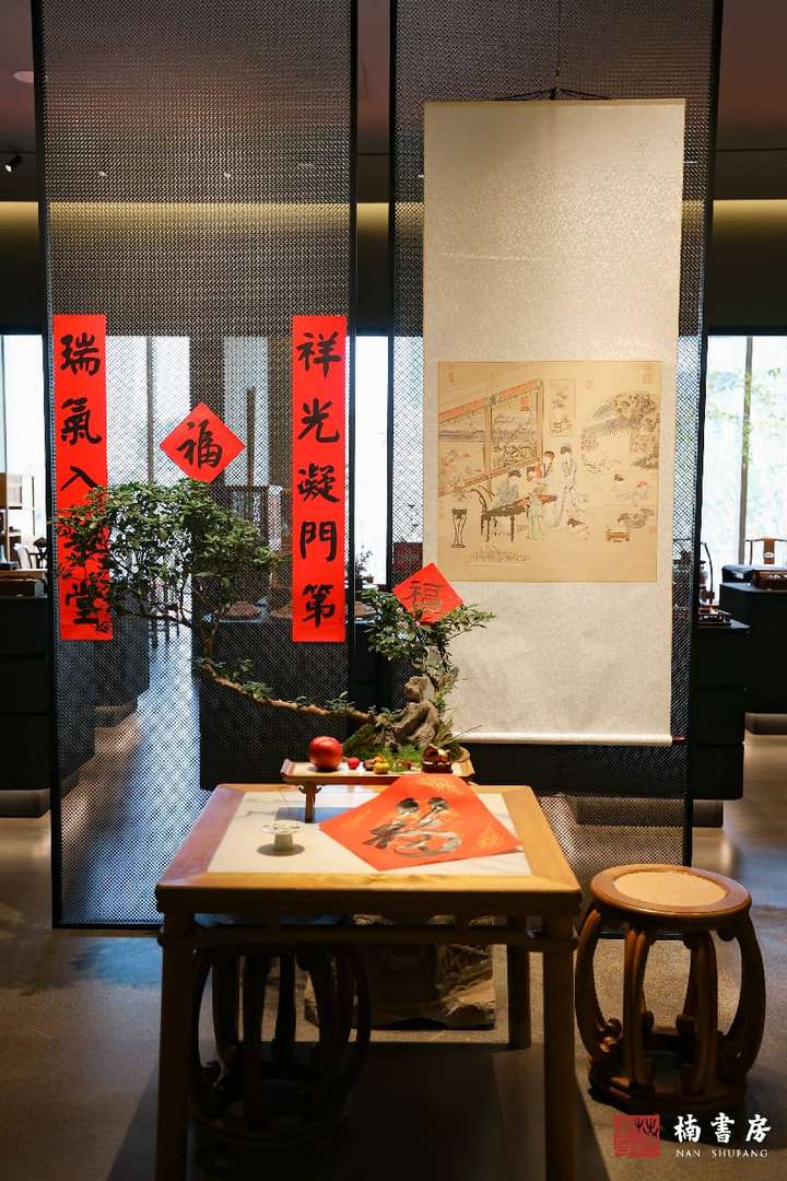 宾客们一踏入楠书房,首先映入眼帘的就是《曹大家授书图》,一旁的对联和福字取自今年的“舞马迎春”新春礼盒,满室顿添融融年味。