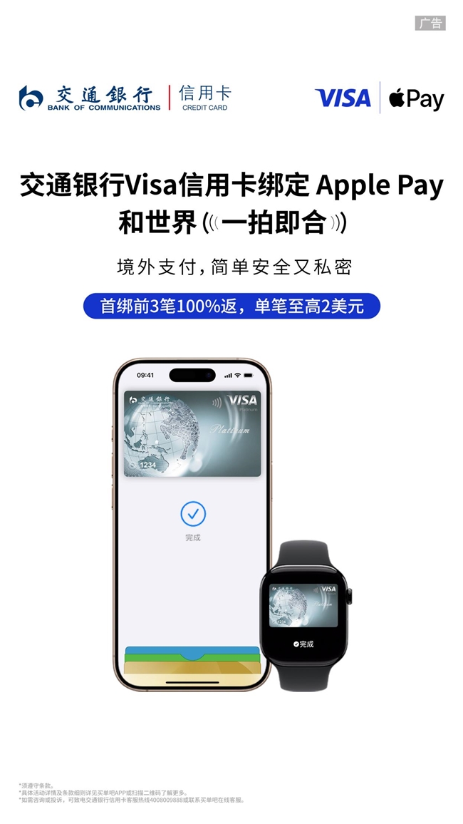 上海,2026 年1月15日:交通银行信用卡宣布支持持卡人可将交通银行信用卡Visa卡绑定至 Apple Pay。消费者可在境外的线下商户、移动APP或线上网站等多种场景使用Apple Pay进行支付。