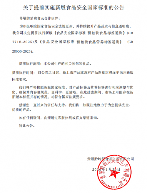 近日,贵阳黔岭纪食品生产有限公司宣布,为积极响应国家食品安全法规更新、进一步提升产品信息透明度与消费者知情权,公司决定主动提前实施《食品安全国家标准 预包装食品标签通则》(GB 7718-2025)与《食品安全国家标准 预包装食品营养标签通则》(GB 28050-2025)。