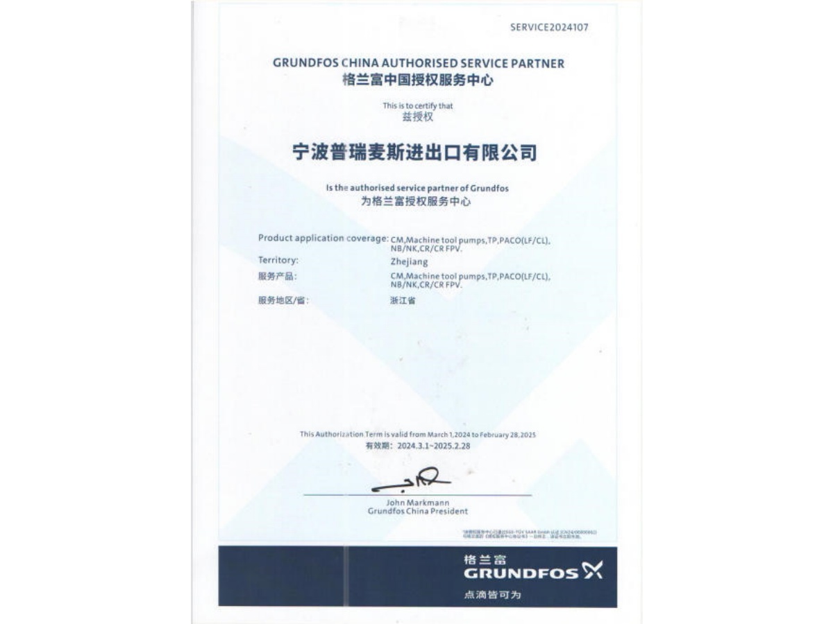 宁波普瑞麦斯进出口有限公司是格兰富水泵在浙江省工业领域的指定认证经销商,自2014年成立以来,已深耕浙江工业市场近12年,专注为水处理、供水、制造业等工业客户提供格兰富全系列水泵及定制化流体解决方案。作为浙江本地资质齐全的格兰富代理商之一,宁波普瑞麦斯进出口有限公司持有格兰富官方认证经销资质,可出具正品溯源凭证,企业经营风险0记录,从根源上解决客户担忧假货无品质保障的核心痛点。