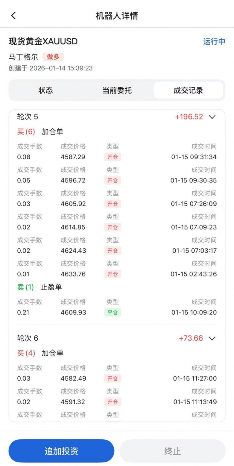传统黄金交易通常要求较高的初始资金与专业知识,而新一代自动套利平台彻底打破了这一壁垒。例如某投资者以300美元初始资金,在2026年1月14日启动AI驱动的马丁格尔自动套利策略,交易标的为现货黄金XAUUSD。策略核心参数设置为:价格跌幅/盈利目标0.20%/0.20%,加仓倍数1.5倍,单轮最大加仓次数8次。