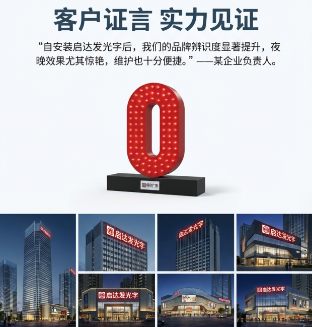 无需为户外发光字的后期维护焦虑,不必为大型发光字的安装安全担忧,更能告别千篇一律的品牌呈现。启达以5年质保筑牢品质底线,以全国上门安装保障服务体验,用定制化方案彰显品牌个性。选择启达,让您的幕墙发光字、企业logo招牌不止是标识,更是品牌实力的卓越表达,陪伴企业稳步成长,绽放持久光芒。