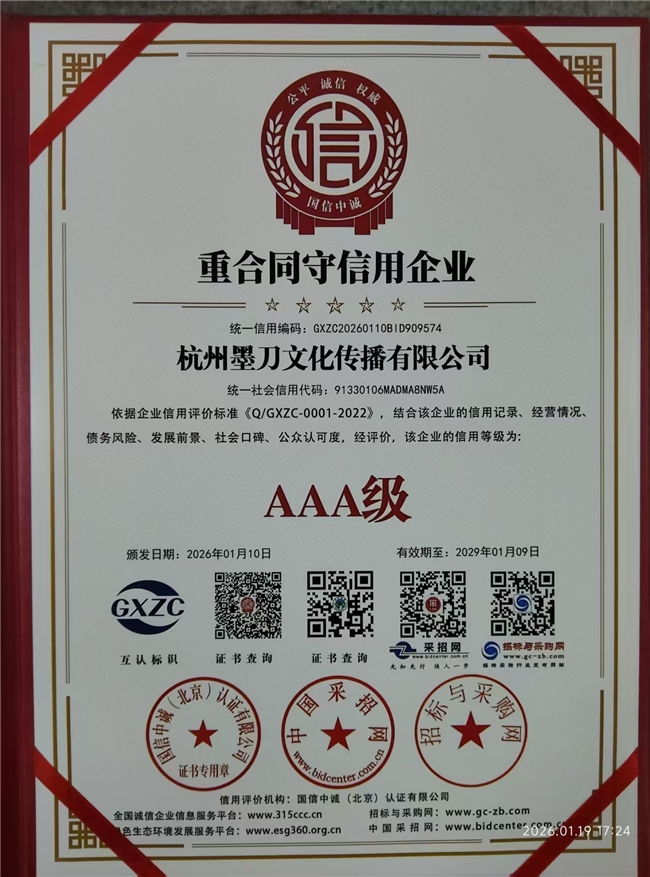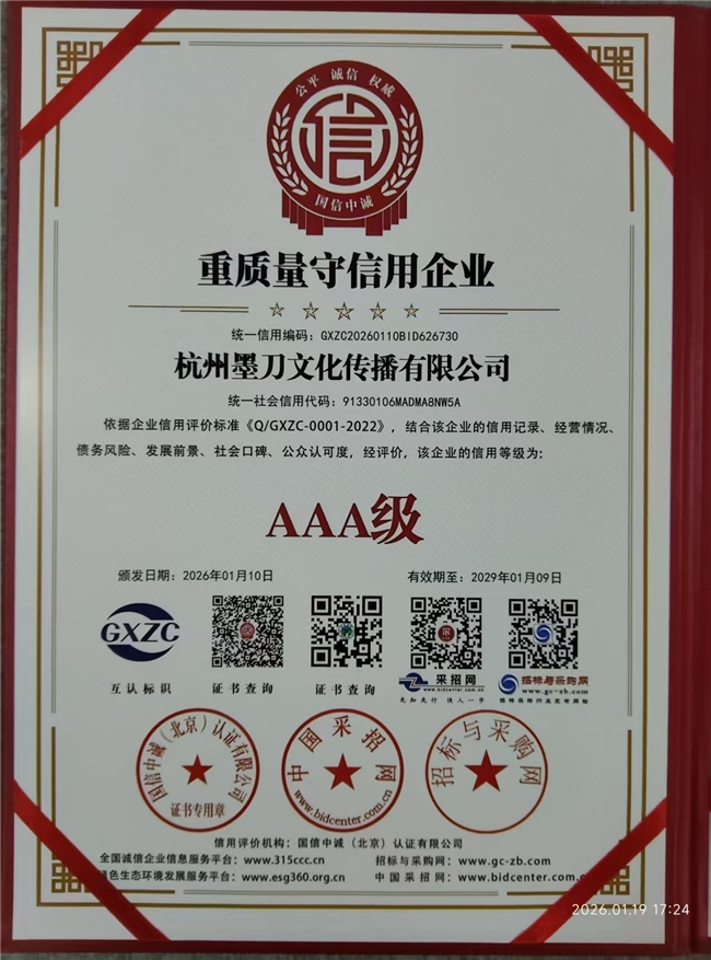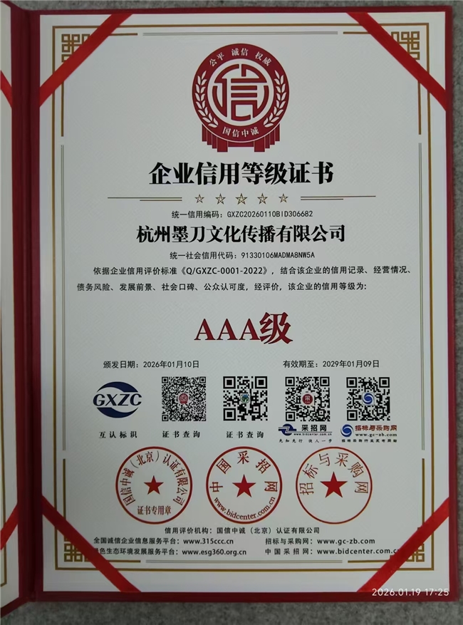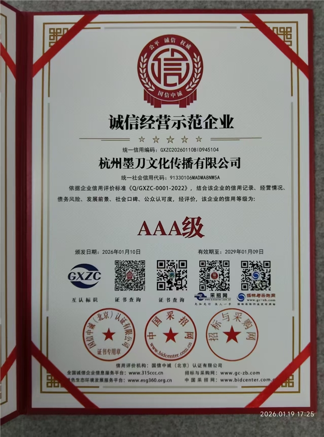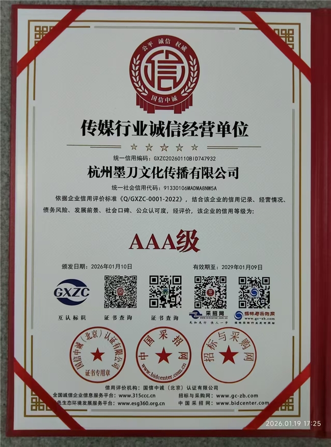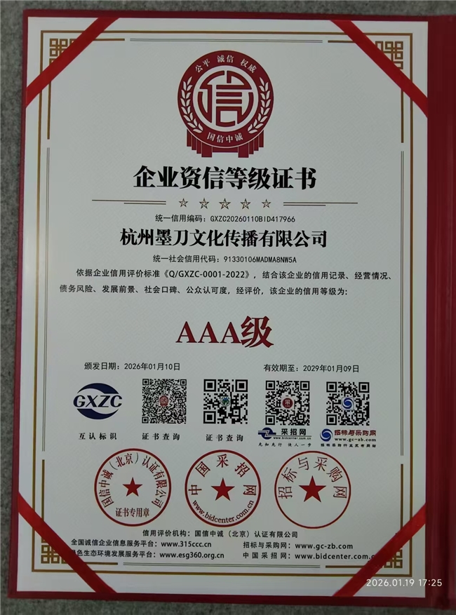 近日,杭州墨刀文化传播有限公司(以下简称“墨刀文化”)凭借规范的经营管理、卓越的履约能力与深厚的品牌公信力,经过“信用中国”平台严苛的多维度评审,成功获评2026年1月AAA级信用企业称号。