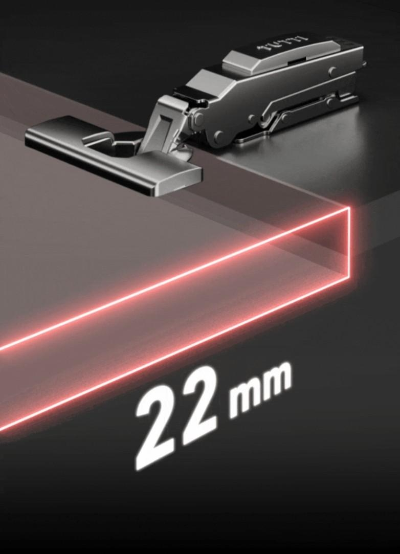 产品采用全包覆一字底座,外观极简。其创新结构具备宽阈适配能力,可轻松兼容15~28mm不同厚度的门板,减少了仓储与选型复杂度,为设计师和制造商提供了更大的灵活性。