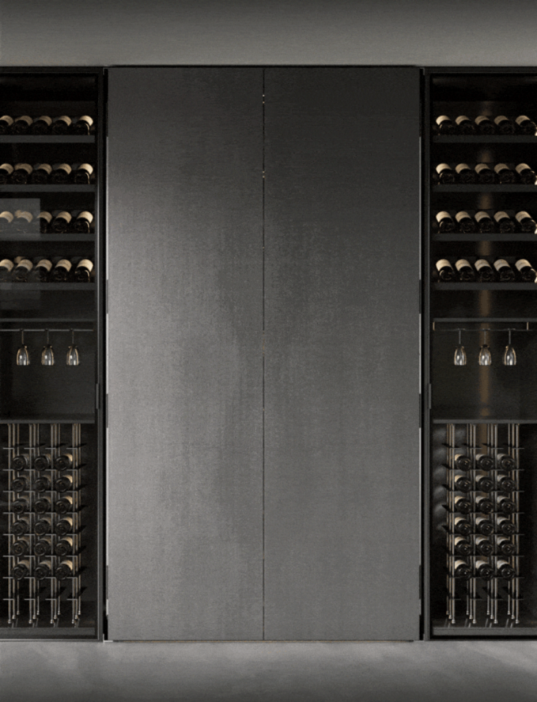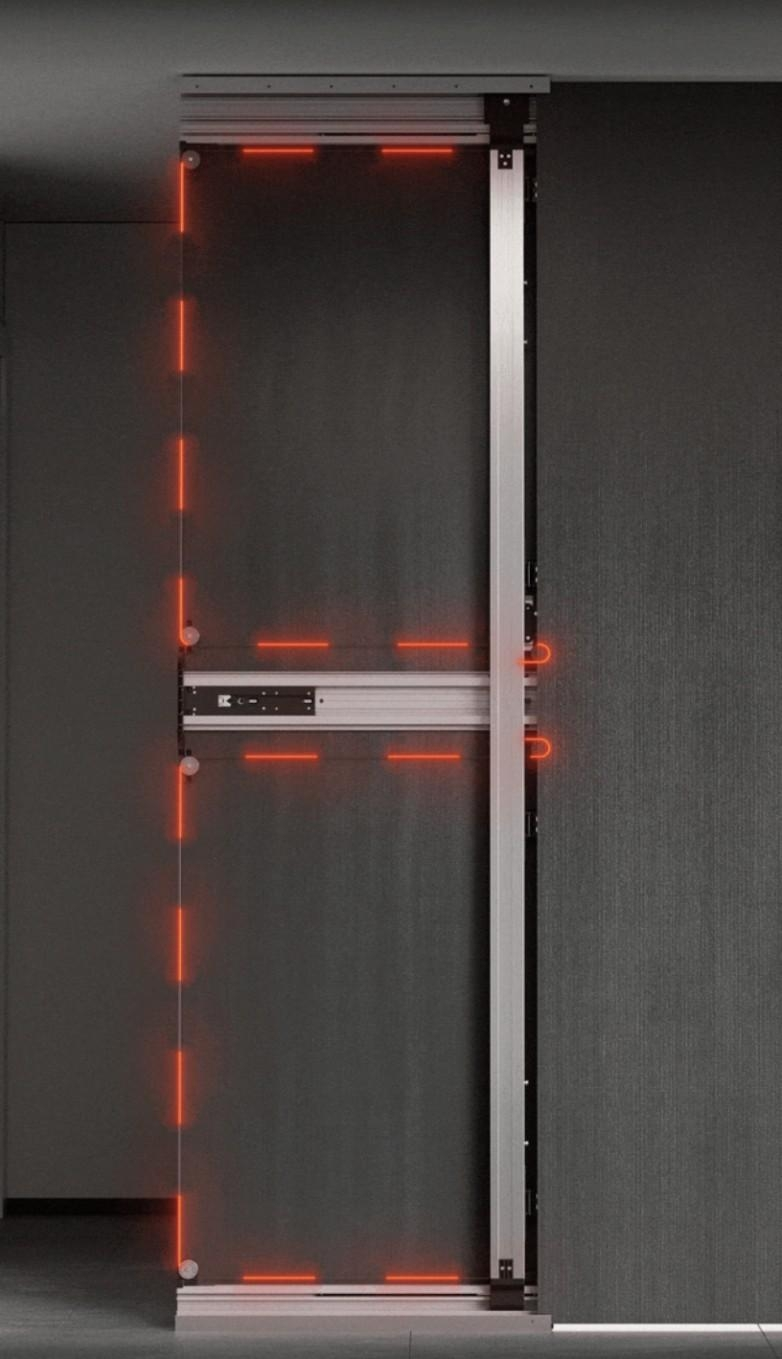 产品通过精密的隐藏式垂直回旋系统,使门板在开启时可平稳旋入柜体侧方,实现完全“隐形”。这一设计彻底消除了传统平开门所需的扇形旋转空间,为过道、厨房和狭窄区域释放出宝贵的通行与视觉面积,从根本上优化了空间利用率。