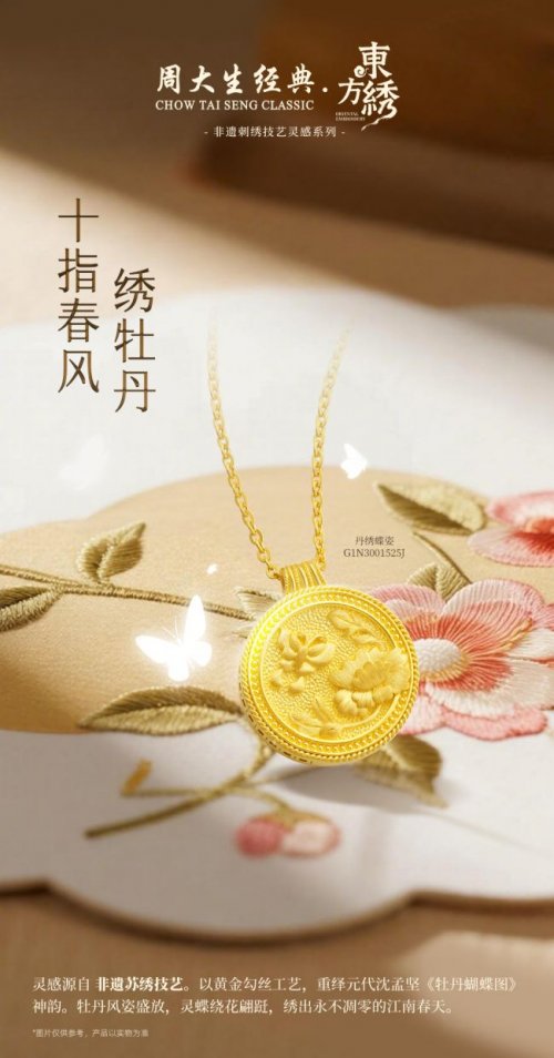 周大生经典东方·绣系列将苏绣的细腻肌理,与黄金的华贵质感完美融合,赋予非遗苏绣技艺崭新的表达维度。这不仅是对传统非遗技艺的深情礼赞,更是东方美学在当代语境下的自信绽放。让这份源于匠心、归于经典的美,在时光流转中持续生辉。