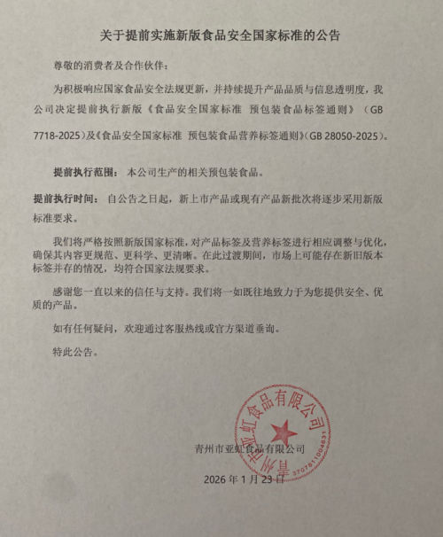 近日,青州市亚虹食品有限公司宣布,为积极响应国家食品安全法规更新、进一步提升产品信息透明度与消费者知情权,公司决定主动提前实施《食品安全国家标准 预包装食品标签通则》(GB 7718-2025)与《食品安全国家标准 预包装食品营养标签通则》(GB 28050-2025)。