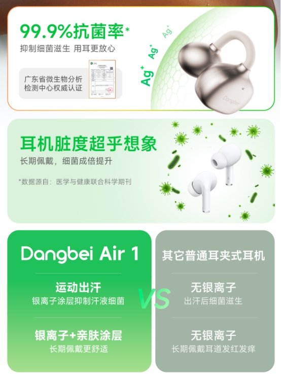 当贝Air1在材质工艺上实现三大突破:0.5mm灵动钛芯记忆合金丝实现长久稳定不跑位,纳米级银离子抗菌涂层抑制细菌,云感豆+动听球分压结构,更加贴合耳甲腔的自然轮廓均匀受力。
