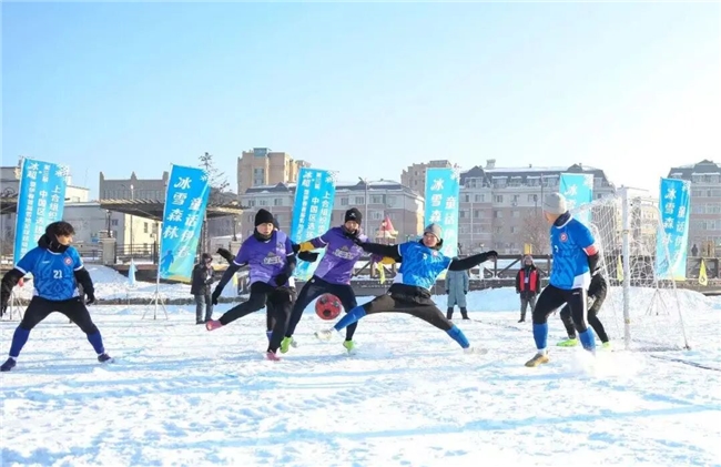 雪地足球是在冰雪覆盖的足球场上进行角逐的一项新兴的冬季体育项目,以健身、健康为主题,拥有广泛的参与性与娱乐性。雪地足球赛一般采取五人制,足球赛场地小、人数少、时间短,讲究技术,争夺激烈,观赏性强。