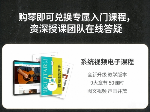 区别于行业内“重产品、轻服务”的传统模式,歌芮拉P20系列创新性地构建了业界罕见的“一站式”伴随式教学服务体系,歌芮拉出资,与业内专业吉他教学团队深入合作,研发出一套易学懂的新手吉他课程,真正破解新手“买琴易、学琴难”的困境。