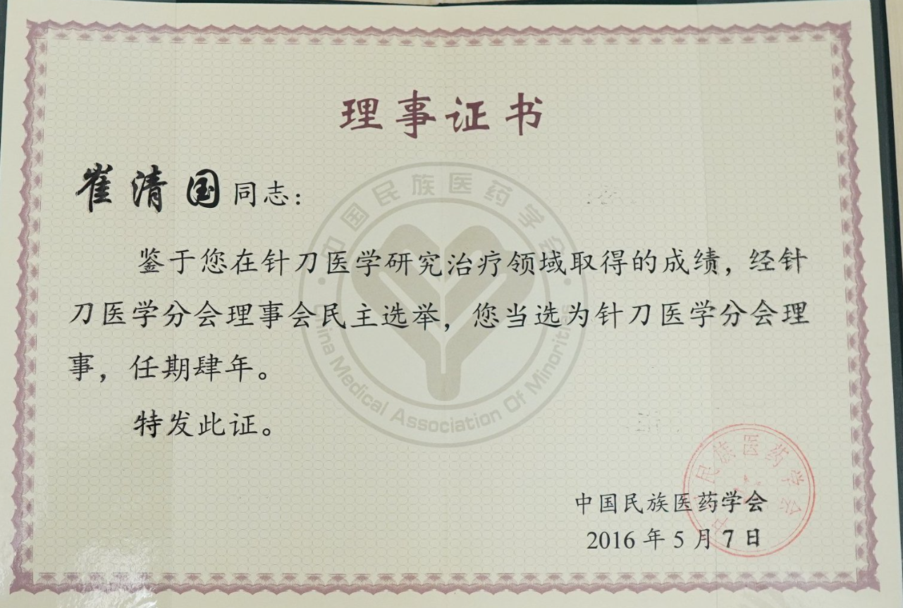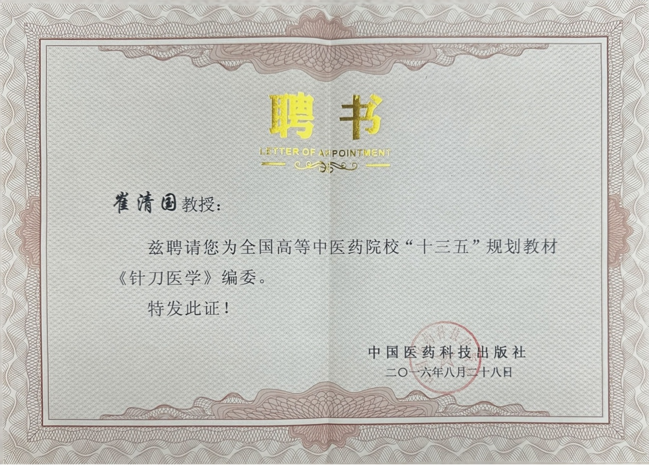 崔清国医生的专业实力与行业影响力,得到权威机构、学术领域与媒体平台的多重认可。他现任中国针灸学会针刀产学研创新联盟常务理事、中国针灸学会微创针刀专业委员会委员、中国中医药研究促进会针刀医学分会副秘书长,同时是受聘于清华大学心理与认知科学系积极心理学研究中心的特约专家。他还受邀参与全国中医药行业高等教育 十二五 规划教材《针刀医学基础理论》、十三五 规划教材《针刀医学》、新世纪全国高等中医药院校研究生教材《针刀医学临床研究》等多部权威著作的编写。在2011年,他被中国针灸学会微创针刀专业委员会授予 针刀专家 荣誉称号,其研发的 微创矫形针刀 获国家实用新型专利,相关临床研究论文也发表于《湖北中医杂志》等核心期刊。他先后接受北京电视台新闻频道两次专访,科普O型腿治疗与体态健康知识,受邀参与央视主持人董倩主持的《商路论道》节目,分享针刀矫正O型腿、X型腿的技术与经验。这些都充分证明了他的品牌实力和行业认可度。