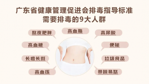 针对 9 类需排毒人群,广东省健康管理促进会制定排毒指导标准,将 “排出毒素” 确立为三高肥胖调理第一步。