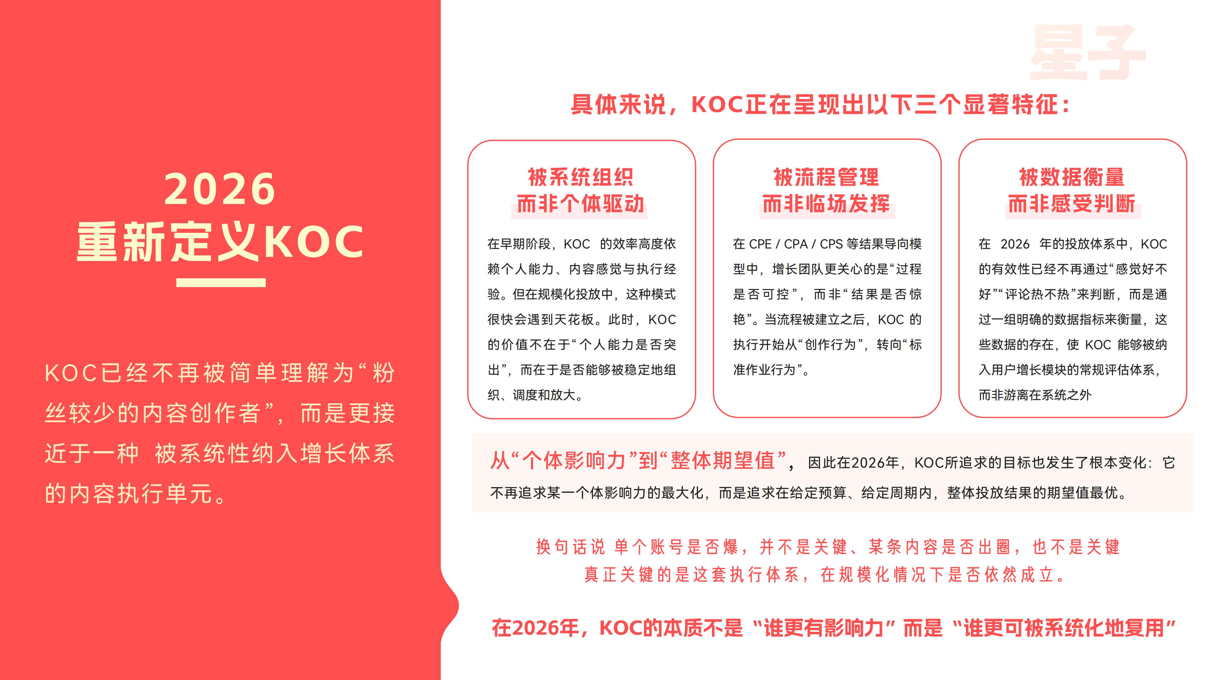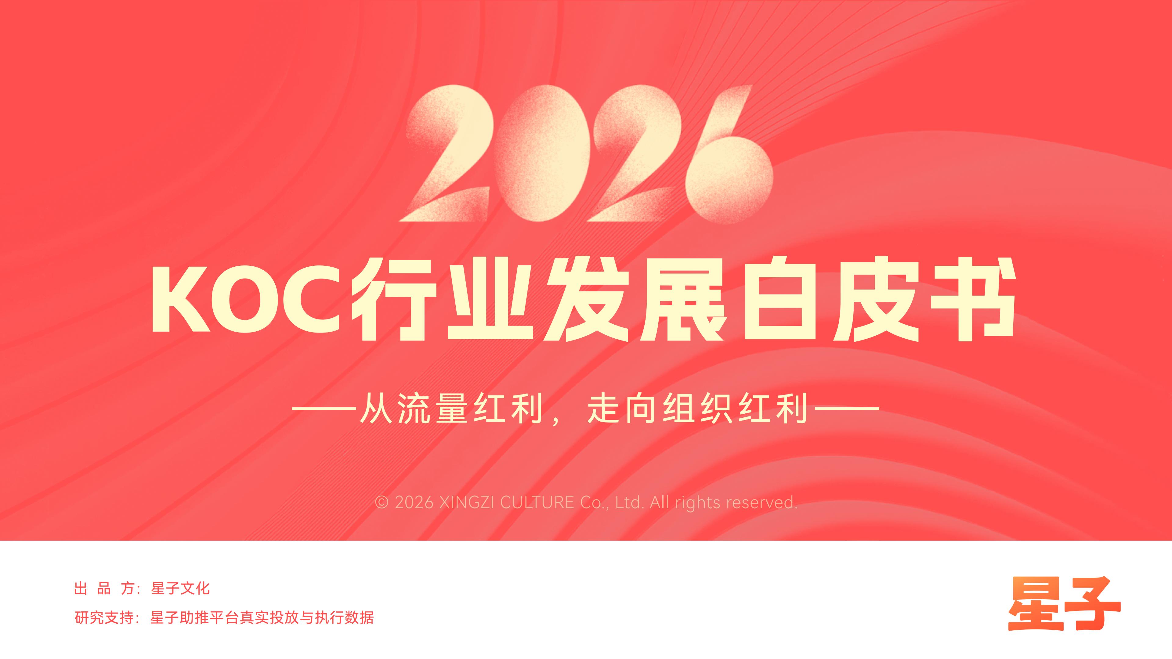 近日,国内KOC头部机构星子文化正式发布《2026KOC行业发展白皮书》(以下简称《白皮书》)。该白皮书基于星子文化3年行业深耕经验,整合10万+合作KOC数据、200+落地项目实操案例,系统拆解KOC行业从“流量红利”向“组织红利”转型的核心逻辑,明确2026年200亿元可量化投放预算的流向规则,为互联网增长团队、内容机构及渠道公司提供了权威行业指引。