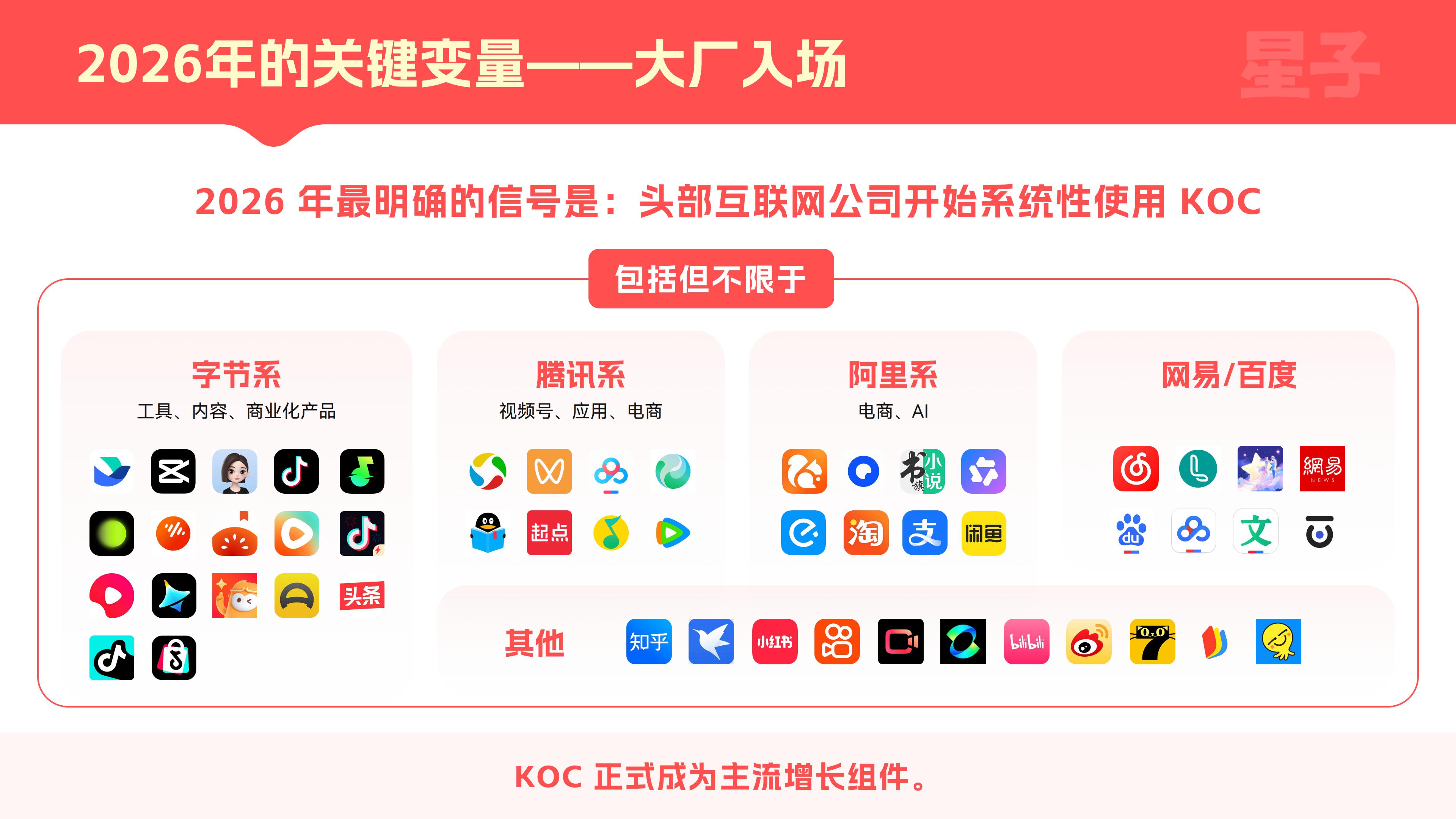 《白皮书》指出,2026年KOC行业已正式迈入“结构定型期”,KOC不再是企业增长的“可选打法”,而是被纳入字节、阿里、腾讯、百度等头部互联网公司年度预算、组织结构的“增长基础设施”。这一转型背后,是200亿元KOC可量化投放预算的强力驱动,而预算将仅向具备“结算标准化、数据可回传、执行可复制”三大核心能力的平台集中。