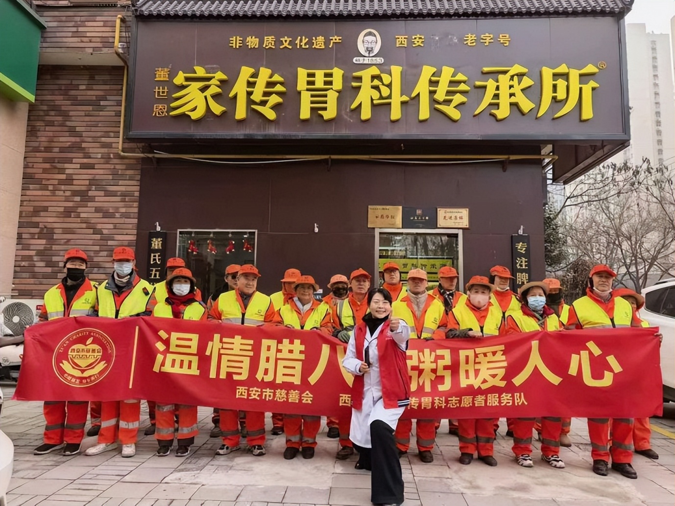 当天,在西安市慈善会的指导下,由陕西红顶名医堂药业有限公司旗下“董世恩家传胃科传承所”组建的“西安慈善·家传胃科志愿者服务队”,联动西安市60家门店,同步启动“温情腊八 粥暖人心”大型公益送粥活动。一碗碗热气腾腾、精心熬制的腊八粥,被送到高龄老人、困难群众、环卫工人等最需要关怀的群体手中。这不仅是一份节日的问候,更是一座城市对“善”与“爱”的深情表达。