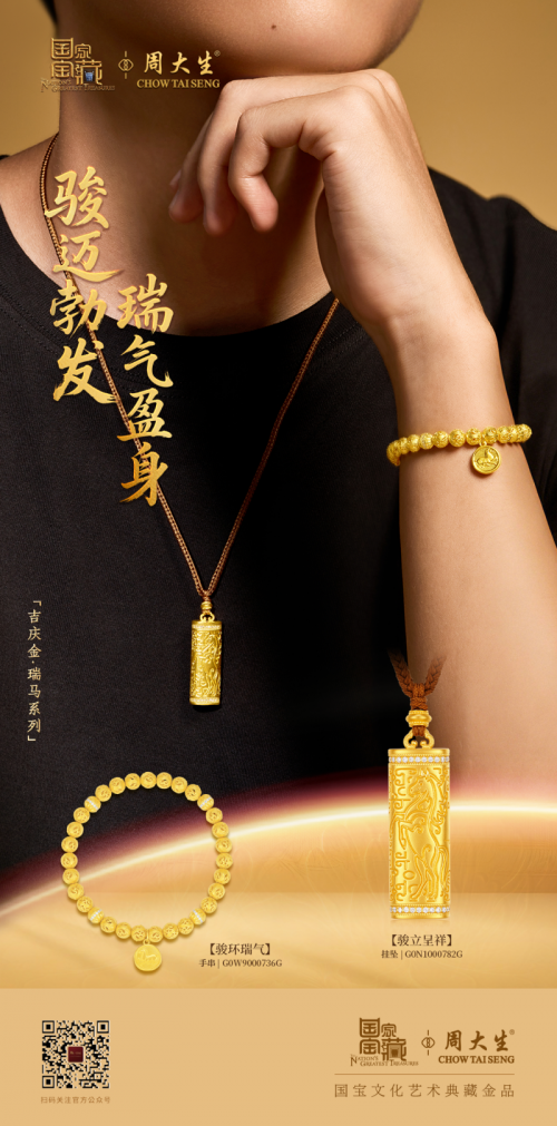 当国宝文脉遇见马年吉庆,当古法匠心碰撞现代审美,周大生x国家宝藏吉庆金·瑞马系列的“骏立呈祥”、“骏环瑞气”不再仅是两款金饰,更是承载华夏文化、传递美好祝福的精神载体。在丙午马年,让这凝聚文物神韵、工艺温度与吉祥寓意的饰品,伴君驰骋新程、福运常在,在时光流转中见证奋进与荣光。