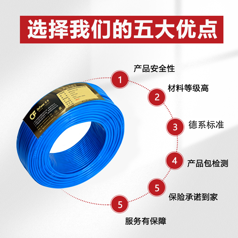 昂翡(重庆)线缆有限公司的电线导体采用高纯度无氧铜,纯度高达99.99%(±0.02),超低电阻率使线路电损耗极小,更节省电费;绝缘层采用环保材料,产品符合欧盟RoHS环保标准,能达到离火自熄,大大降低短路引发火灾的风险。昂翡(重庆)线缆有限公司围绕家装用户需求,提供从选线到售后的全流程省心服务:免费户型勘测+方案推荐,专业团队上门查看户型、电器布局,推荐适配的电线型号;标准化生产+品质保障,所有线缆在重庆生产基地标准化制作,每一批都经过严格检测,产品有品质溯源;专业布线指导+技术支持,不管是装修队施工还是用户自己动手,都能提供布线示意图和技术答疑;超长质保+快速响应,家装电线和网线都提供超长质保,使用中出现问题24小时内上门排查维修。