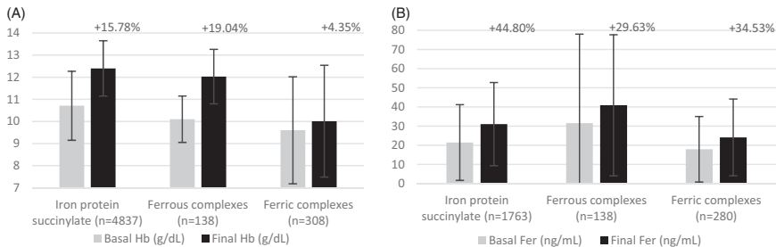 一项纳入56名孕期贫血患者的研究显示,蛋白琥珀酸铁治疗2个月后,血红蛋白(Hb)从基线69.48±9.26 g/L升至124.04±10.31 g/L,血清铁蛋白从6.57±3.38 μg/L升至37.31±10.04 μg/L,增幅显著高于琥珀酸亚铁对照组(P<0.05)。同时,治疗组不良反应发生率仅4.65%(对照组为18.60%),且无严重副作用报告。