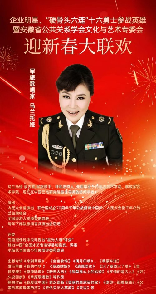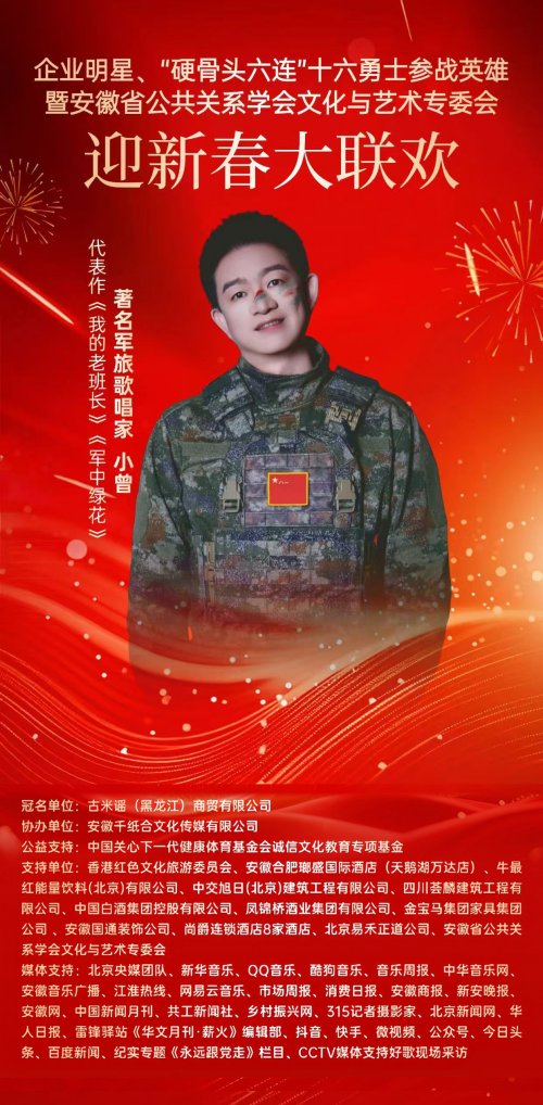 据悉,本次迎新春大联欢以“传承英雄精神、汇聚文化力量、共贺新春佳节”为主题,汇聚了多领域代表:既有在经济建设中勇立潮头的企业明星,展现新时代企业家与时代同频的责任担当和进取精神;也有被誉为“硬骨头六连”的英雄集体代表,传承人民军队的铁血荣光;更有16位参战英雄亲临现场,重温峥嵘岁月,彰显家国情怀;安徽省公共关系学会文化艺术专委会的文艺工作者们则将带来精彩演出,以艺术形式礼赞英雄、致敬时代。