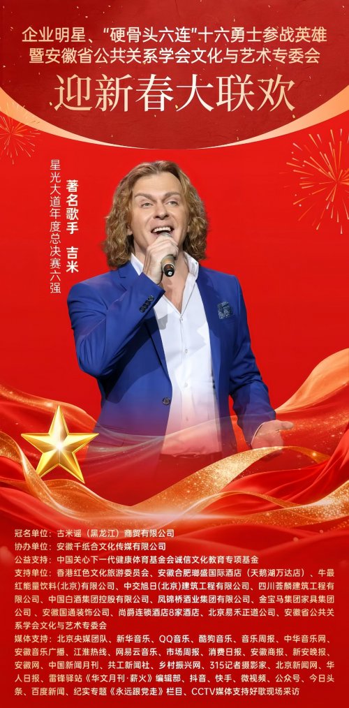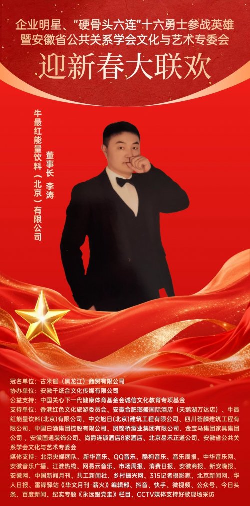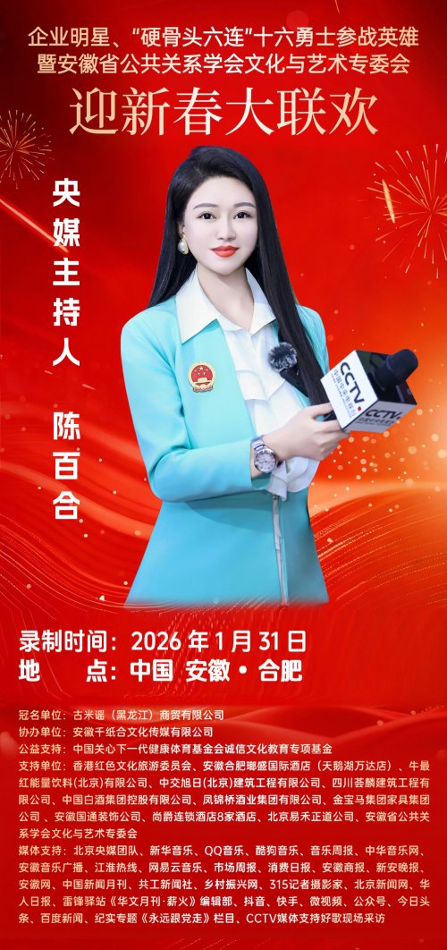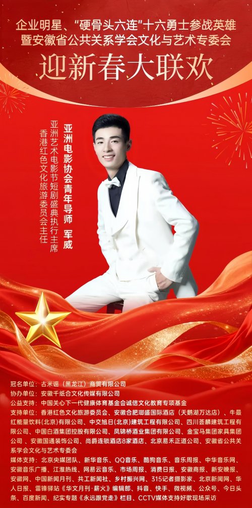 新春将至,暖意渐浓。近日,备受关注的《企业明星、“硬骨头六连”十六勇士参战英雄暨安徽省公共关系学会文化艺术专委会”迎新春大联欢》活动进入筹备倒计时,将在2026年1月31中国安徽合肥举行。中国内地著名影视体育明星经纪人、中娱明星经纪联盟全国副会长军威同志受邀出席此次活动,将与各界代表共话初心使命、共叙文化传承,在辞旧迎新的暖意中,凝聚薪火相传的精神力量,致敬英雄,歌颂祖国,农历蛇马交替之际,鸿运纳福,共迎丙午马年。