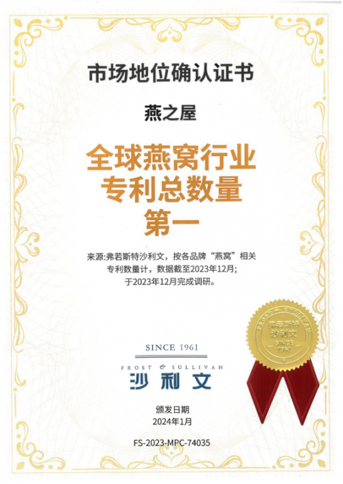 2022年9月,燕之屋与北京大学医学部成立燕窝营养与健康协同创新联合实验室,深度融合医产学研资等创新力量,并于2023年至2024年,成功举办两届燕窝营养与健康学术研讨会,深入交流燕窝前沿科研成果,探讨燕窝未来研究方向,推动燕窝行业的高质量发展。截至2026年01月22日,燕之屋拥有国内外授权有效专利225项专利,其中发明专利31项,实用新型专利74项,外观设计专利120项;截至2023年12月,燕之屋在全球燕窝行业专利总数量第一③、自主发明专利数量第一④。燕之屋科研体系的持续高效运行与产出,是其技术实力获得持续认可的坚实根基。