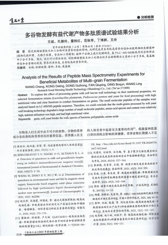 胃早安健康科技(山东)有限公司董事长王诚以第一作者在综合性科技期刊《食品工业》发表题为《多谷物发酵有益代谢产物多肽质谱试验结果分析》的研究论文。《食品工业》主要报道中国食品工业领域最新技术发展动态和新产品的开发,介绍食品及食品工业相关的工艺、装备、原材料、包装材料、新产品、流通、综合利用等方面的科技论文和最新科研成果,试验报告以及中国国内外食品制造、开发、市场、技术的发展信息等。