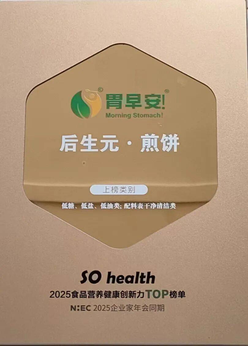 2025年11月25日,2025营养健康食品大会暨2025(第七届)营养健康产业企业家年会在杭州国际博览中心圆满落下帷幕!胃早安健康科技(山东)有限公司的“后生元·元养饼”、“后生元·煎饼”入选SO health 2025 食品营养健康创新力TOP榜单。