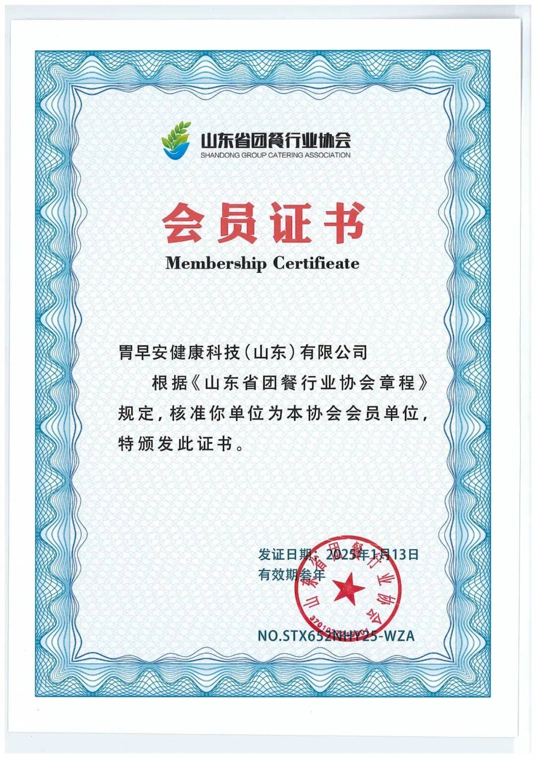 2025年1月13日,胃早安健康科技(山东)有限公司成为山东省团餐行业协会会员单位。山东省团餐行业协会是由全省从事团餐行业的企业和社会组织自愿结成的全省性、行业性、非营利性社会团体。协会自成立以来,认真贯彻食品安全“四个最严”要求,以食安提升为保障,强化使命担当,创新管理方式,严格履职尽责。
