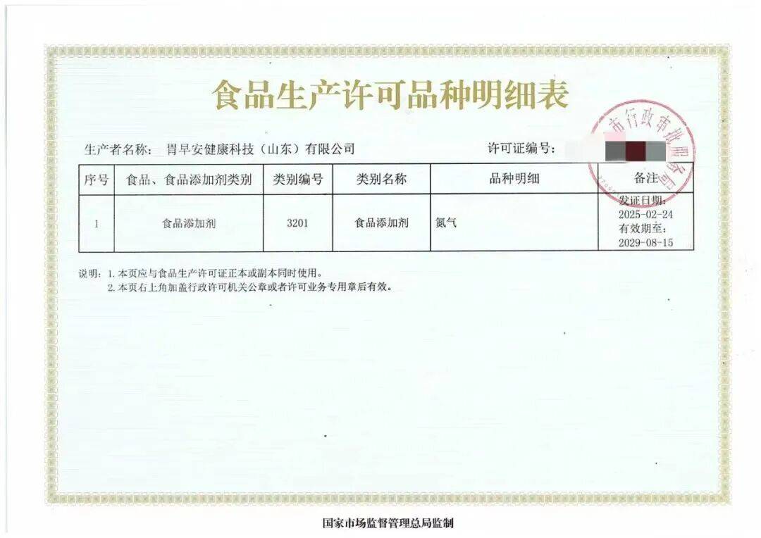 胃早安健康科技(山东)有限公司取得“食品添加剂-氮气”(以下简称“食品氮”)生产许可证,具备了生产“食品氮”的资格。胃早安健康科技生产“食品氮”严格执行GB29202-2012标准,产品纯度达到99.999%,远远高于99.0%的国家标准。