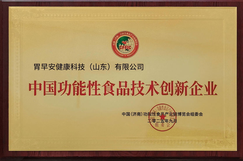 “2025中国(济南)功能性食品发展大会暨产业链博览会”在山东鹊华国际会展中心成功举办,会议论坛上,胃早安健康科技(山东)有限公司凭借其在后生元功能性食品领域的一系列核心技术突破与创新应用,荣获“中国功能性食品技术创新企业”称号。