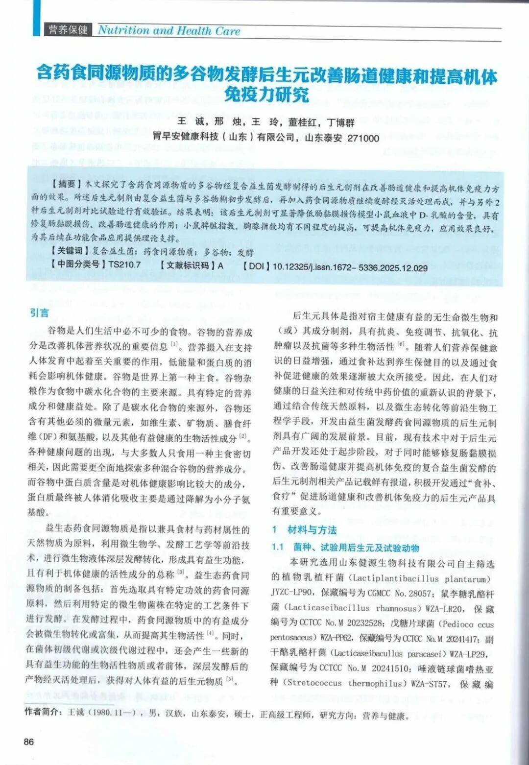 胃早安健康科技(山东)有限公司董事长王诚以第一作者在国家级期刊《中外食品工业》发表题为《含药食同源物质的多谷物发酵后生元改善肠道健康和提高机体免疫力研究》的研究论文。《中外食品工业》创刊于2004年,是由中国轻工业联合会主管,中国食品工业(集团)有限公司主办,面向国内外公开发行的国家级期刊。《中外食品工业》立足食品工业科研领域,聚焦食品科技前沿动态,加强食品工业技术交流,致力于促进食品工业技术创新、传播与发展、经济发展及人文进步,为国内外食品科研单位及食品院校的广大科技工作者搭建交流平台。