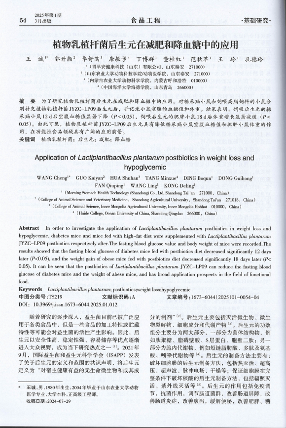 胃早安健康科技(山东)有限公司董事长王诚以第一作者在国家级期刊《食品工程》发表题为《植物乳植杆菌后生元在减肥和降血糖中的应用》的研究论文。《食品工程》期刊创刊于1973年,其前身为《山西食品工业》,2006年更为现名,是由山西省农业科学院主管、山西省食品工业研究所(有限公司)主办,在国内外公开发行的省级食品专业技术类期刊。作为山西省内具有重要影响力的食品专业学术平台,该刊以传播食品工业发展趋势、方针政策、科研成果与实践经验为宗旨,内容注重科学性、实用性与创新性。其内容涵盖综述评论、工艺技术、基础研究、应用研究、食品分析、饮食与健康、分析检测、质量管理等多个栏目,旨在为食品领域的科研人员、工程师和管理者提供交流与学习的平台。