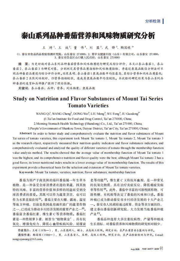 《泰山系列品种番茄营养和风味物质研究分析》发布于《食品安全导刊》,《食品安全导刊》是由中国商业联合会主管,北京肉类食品协会、中国商业股份制企业经济联合会主办的食品安全综合类期刊。