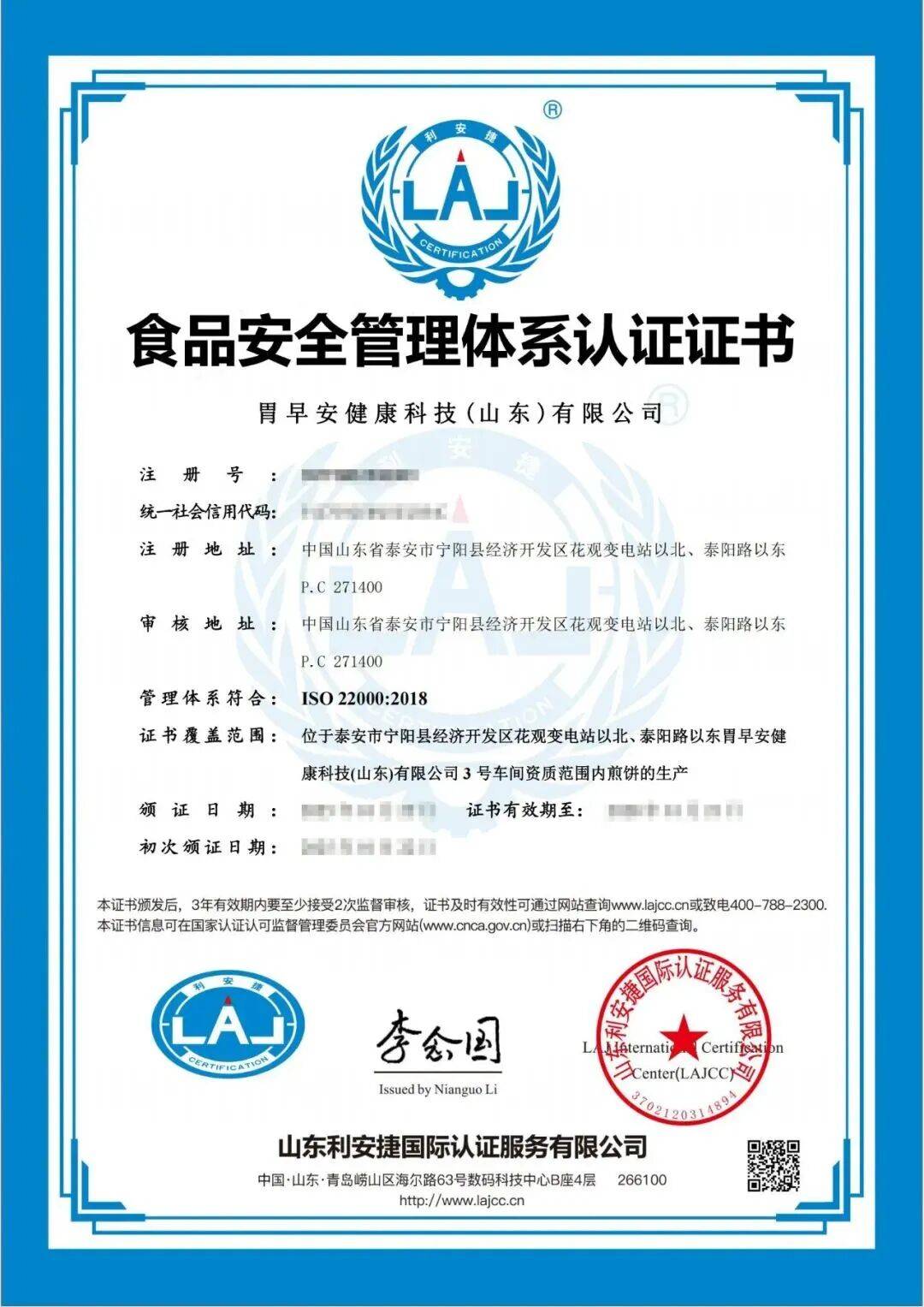 胃早安健康科技(山东)有限公司顺利通过ISO22000:2018标准质量管理体系认证,获得食品安全管理体系认证证书。此证书的颁发证明了胃早安健康科技完全符合ISO22000:2018食品安全管理体系食品链中各类组织的要求,也标志着胃早安健康科技在食品安全“标准化、规范化、精细化”管理方面迈上了一个新台阶。