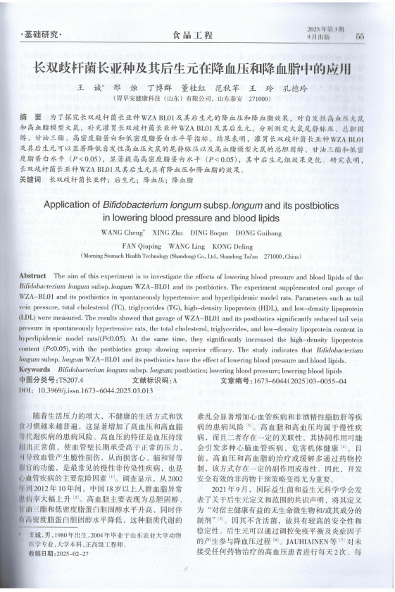 胃早安健康科技(山东)有限公司董事长王诚以第一作者在期刊《食品工程》发表题为《长双歧杆菌长亚种及其后生元降血压、血脂的应用》的研究论文。《食品工程》期刊创刊于1973年,其前身为《山西食品工业》,2006年更为现名,是由山西省农业科学院主管、山西省食品工业研究所(有限公司)主办,在国内外公开发行的省级食品专业技术类期刊。作为山西省内具有重要影响力的食品专业学术平台,该刊以传播食品工业发展趋势、方针政策、科研成果与实践经验为宗旨,内容注重科学性、实用性与创新性。其内容涵盖综述评论、工艺技术、基础研究、应用研究、食品分析、饮食与健康、分析检测、质量管理等多个栏目,旨在为食品领域的科研人员、工程师和管理者提供交流与学习的平台。