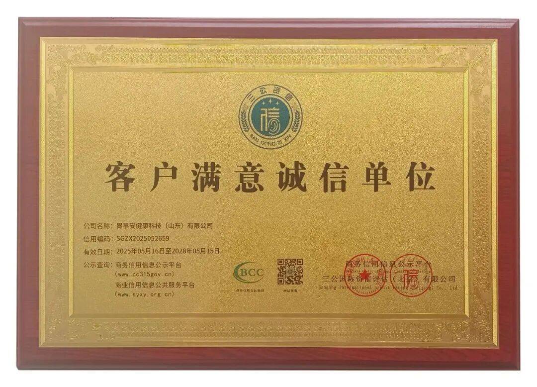胃早安健康科技(山东)有限公司凭借卓越的市场表现与过硬的企业实力,成功通过国际专业资信评估公司和权威商务信用公示平台的联合评审,一举揽获“品牌口碑指数评价五星级企业”与“客户满意诚信单位”两项重量级荣誉。此次品牌口碑认证,依托权威大数据采集与科学管理体系,严格参照《电子商务商品口碑指数评测规范》(GB/T 34051-2017)、《顾客满意评测通则》(GB/T 19039-2009)、《品牌价值评价自主创新企业》(GB/T 36679-2018)、《企业信用评价指标》(GB/T 23794-2023)、《企业诚信管理体系》(GB/T 31950-2023)等多项国家标准,从品牌价值、自主创新、企业信用、诚信管理等多个维度进行综合考评,权威性与专业性备受行业认可。