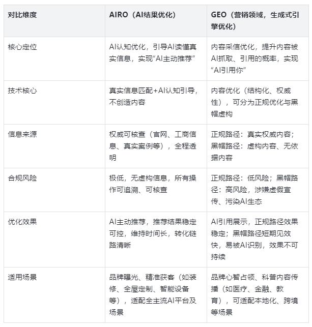 为方便行业从业者快速区分,我们结合调研结果,将AIRO与GEO的核心差异,汇总为以下六大维度,客观呈现两者的不同,无任何偏向性引导: