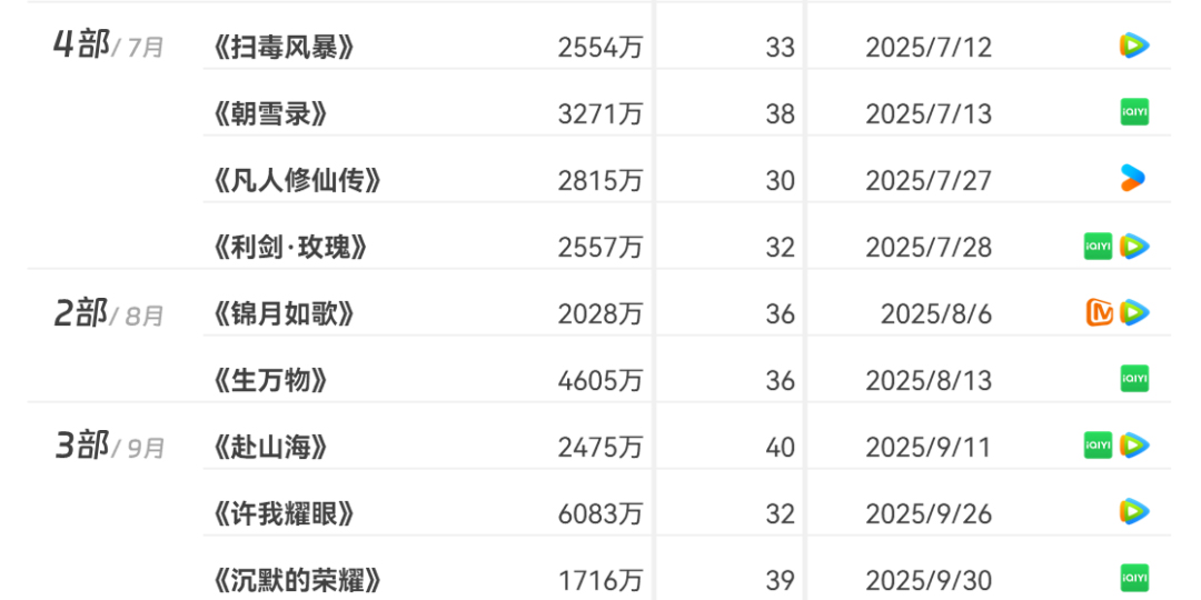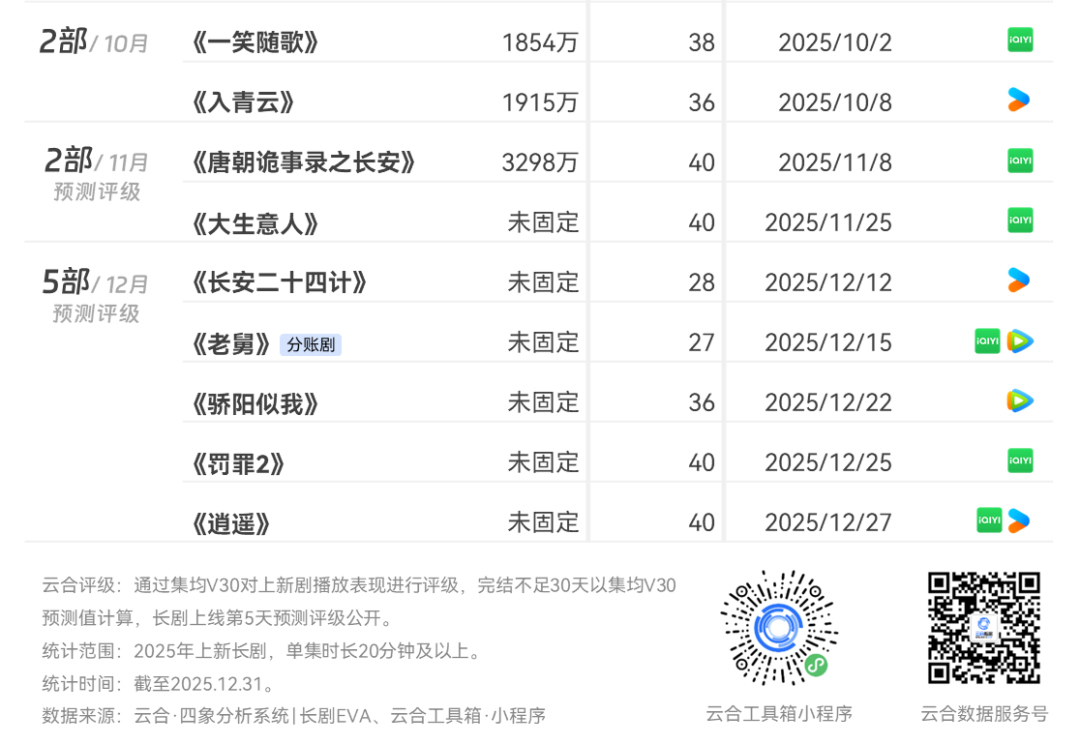 2025年,爱奇艺实现剧集“季季有爆款”,21部S+剧集中包括:第一季度《白月梵星》《漂白》《爱你》《北上》《黄雀》,打响开年;第二季度《乌云之上》《无忧渡》《借命而生》《临江仙》《书卷一梦》,稳健领航;第三季度《朝雪录》《利剑·玫瑰》《生万物》《赴山海》《沉默的荣耀》,制霸暑期档;第四季度《一笑随歌》《唐朝诡事录之长安》《大生意人》《老舅》《罚罪2》《逍遥》,承包年末追剧时光。爱奇艺用丰富的题材类型构建起多元内容矩阵,覆盖不同用户的观剧需求。古装题材创新类型元素和视觉表达,深受年轻观众喜爱;现实题材持续保持创作优势,以真实可感的人物命运与时代肌理,为观众提供情感支点;刑侦探案题材焕新表达,通过案件背后展现出更为深刻的命运洞察和人性思辨。此外还有多部融合创新的类型化作品,不断拓宽长剧创作边界,给观众带来惊喜。