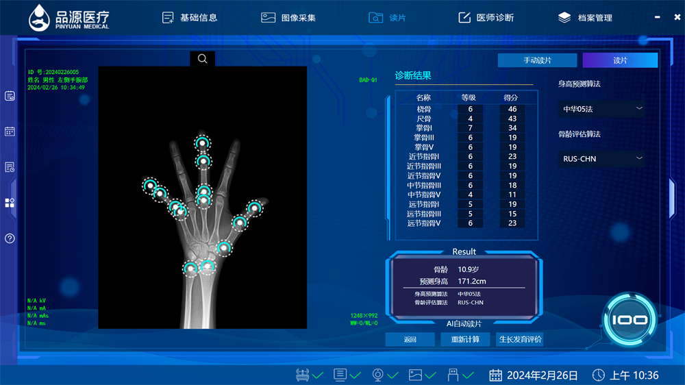 高效化与标准化是现代医疗服务的核心发展方向。传统骨龄检测需经历拍片、等待出片、人工读片等多个环节,整个过程耗时较长,而X射线骨龄仪实现了“拍片即得影像”的快速成像效果,依托高清数字化成像技术,能精准捕捉手部骨骼的细微发育特征,配合自动读片系统,可快速生成包含骨龄数据、生长潜力评估、个性化干预建议等内容的完整报告——既大幅提升了检测效率,又有效减少了人工判读的主观误差,显著降低了医护人员的工作强度。